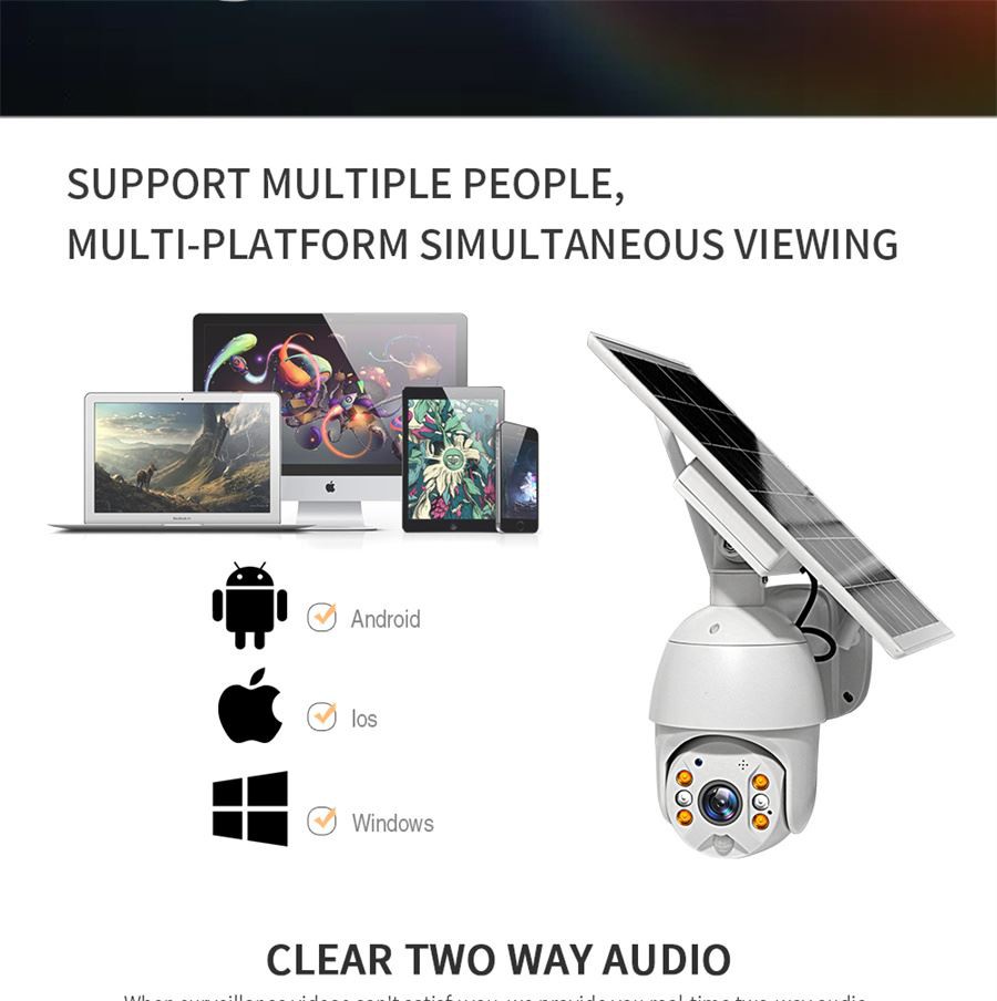 Diese Solar Home Security Cameras mit IP66 hervorragender Wetterfestigkeit, diese kabellose WLAN-Solarkamera kann verhindern, dass Wasser in die Kamera eindringt, und hält einem Temperaturbereich von -20 Grad bis 50 Grad stand, der schwierigeren und extremeren Bedingungen standhält wie Wind, Regen, Schnee. Geben Sie Ihrer Haussicherheit eine kontinuierliche 24-Stunden-Videoüberwachung